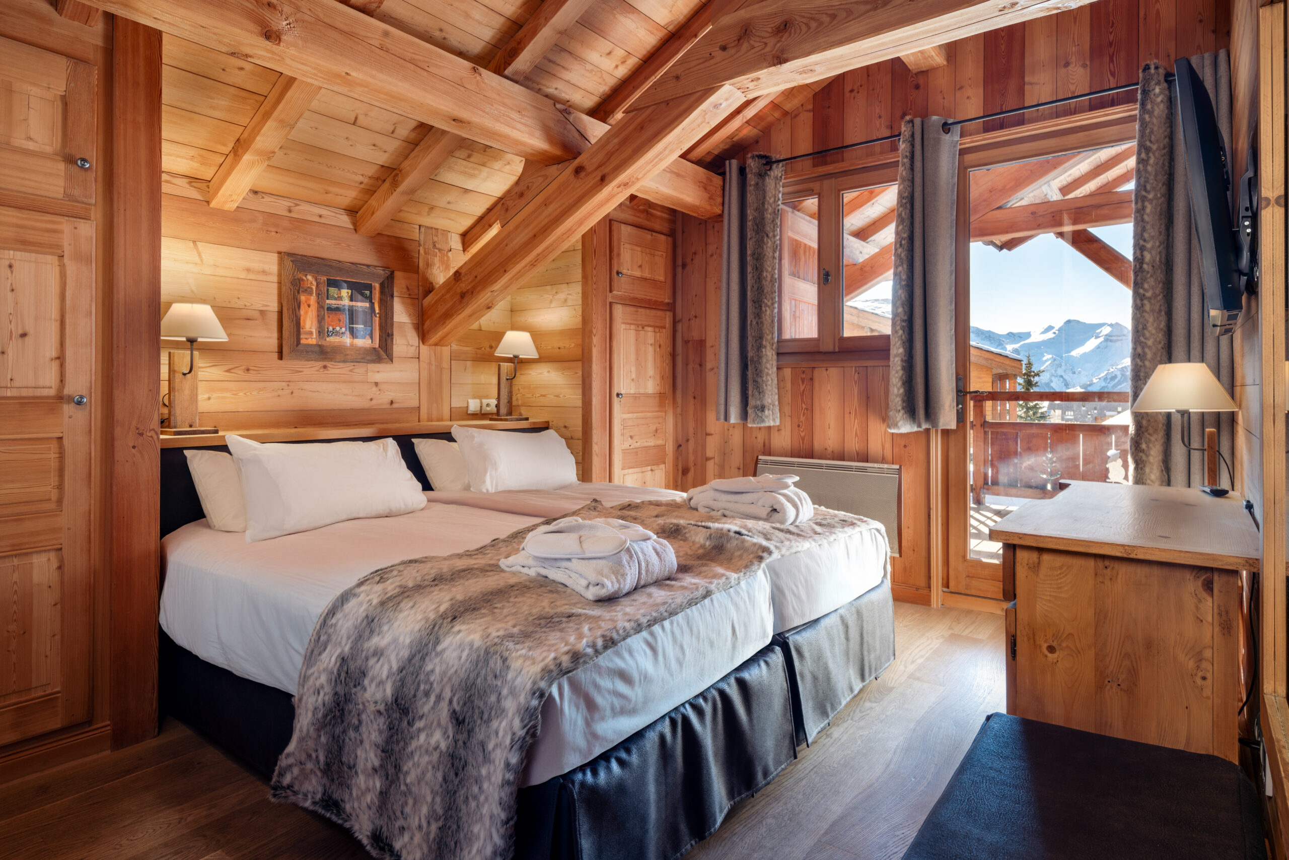 2 luxe chalets van 350m2 en 7 slaapkamers voor 14 personen en 300m2 en 6 slaapkamers voor 12 personen. Alle kamers, met toilet en bad of douche, hebben een balkon met uitzicht op de skipistes. Alle kamers hebben tv en wifi.